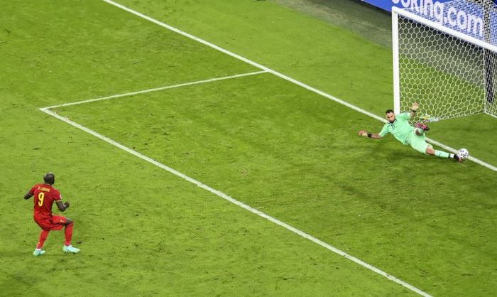 Belgieren er iskald. Sender Donnarumma feil vei, og setter ballen kaldt i mål. Foto: AP