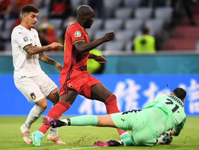 Lukaku spilles gjennom av De Bruyne. Det er nesten for Belgia, men Donnarumma er med på notene. Foto: EPA