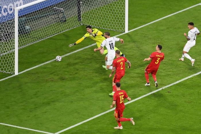 Chiesa er nær ved å score for Italia på en kontring. Han prøver vel på et innlegg som går via en belgisk forsvarer og endrer retning. Courtois får opp hendene og holder ballen.