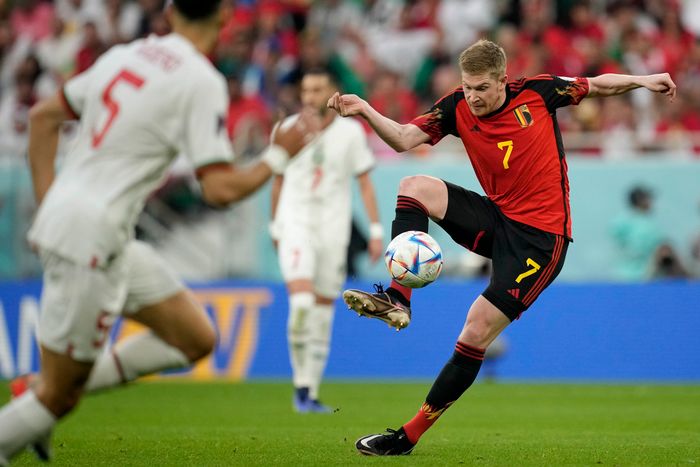 De Bruyne forserer fremover, men blir passet godt på av marokkanerne. Manchester City-spilleren mister ballen.