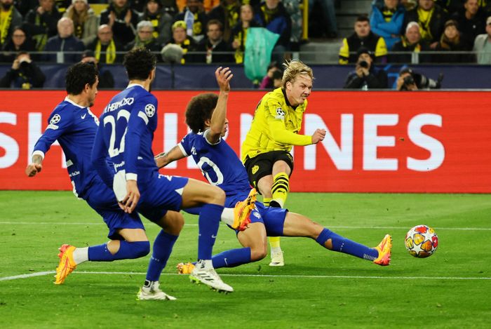 Julian Ryerson (Borussia Dortmund) får gult kort i duell med Cesar Azpilicueta. Dypt uenig, nordmannen.