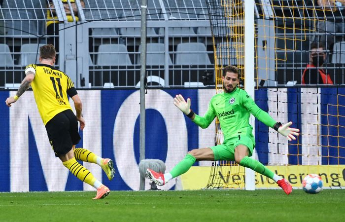Annullert mål! Reus prøver å drible seg gjennom, men lykkes ikke. Trapp kommer ut for å hindre at den skal gå ut til corner, men mister ballen. Reus setter inn returen fra spiss vinkel, men etter en VAR-sjekk annulleres det ettersom ballen gikk ut av spill før Trapp fikk en hånd på ballen.