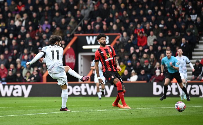 Salah får ballen nesten helt inne på Bournemouths femmeter, men der er det fryktelig trangt og egypteren mister ballen uten å få skutt.