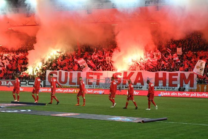 Lagene er på banen. Brann Stadion bygges om, men rammen er likevel fantastisk. "Gullet skal hem", står det på et stort banner bak det ene målet. Foto: VG