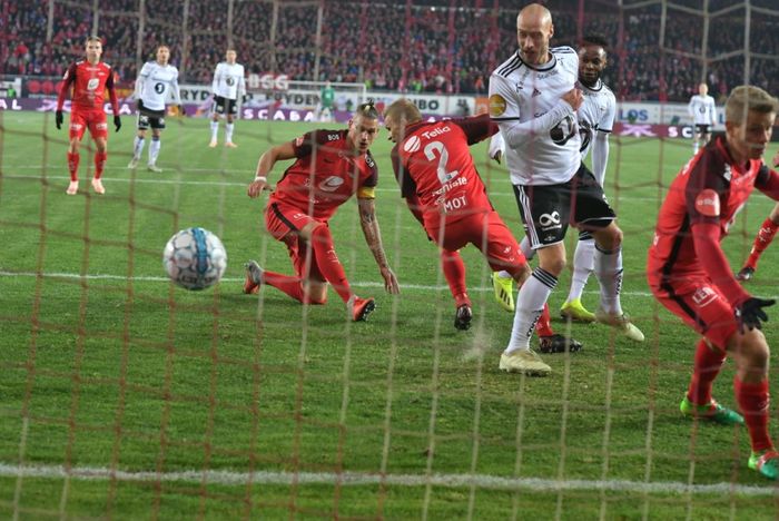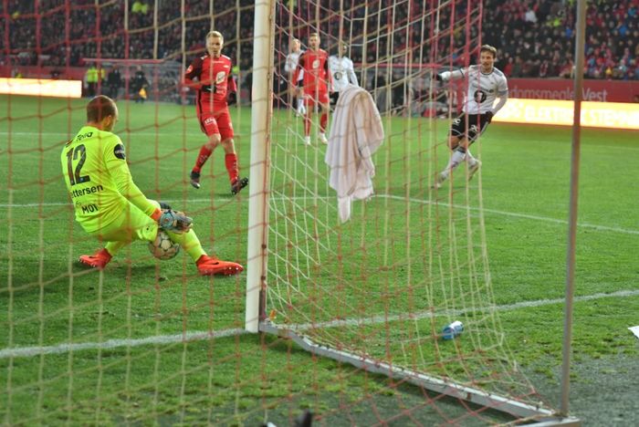 Rosenborg tar ledelsen i gullkampen! I sitt comeback fra start bruker han drøye 13 minutter på å pirke ballen over streken. Det er masse trafikk foran mål, og dermed uoversiktlig for både angripende og forsvarende lag. Foto: VG