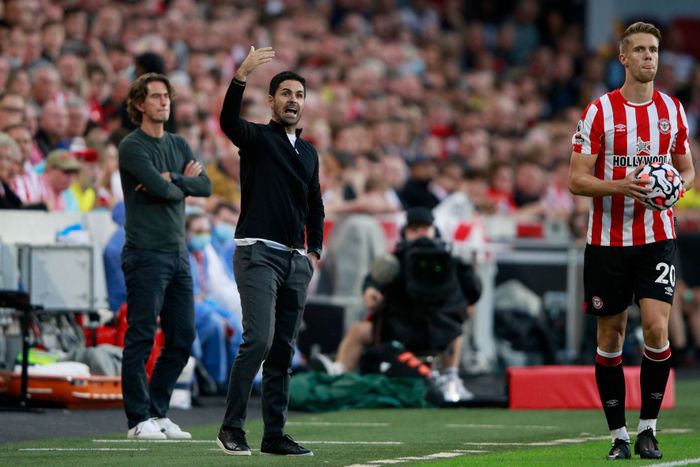 Brentford presser høyt og stresser Pablo Marí, som litt desperat klarerer via en Brentford-spiller og ut til kast.