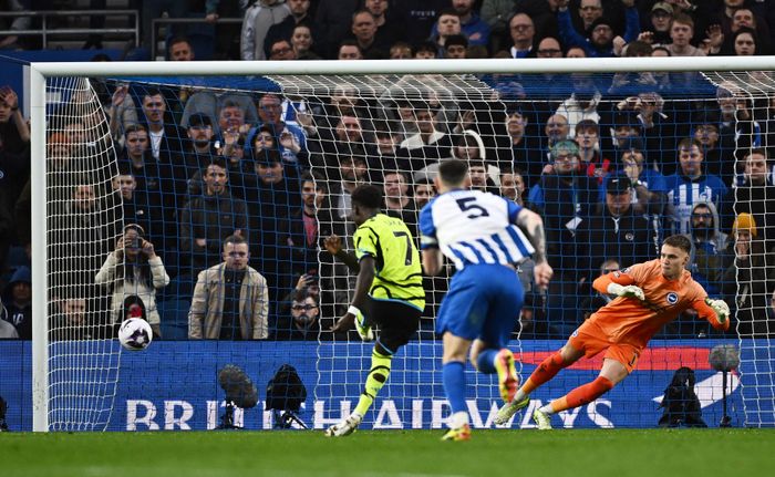 Brighton med meget bra angrep, men den avgjørende pasningen mot Welbeck er altfor dårlig og ender inne hos Raya.