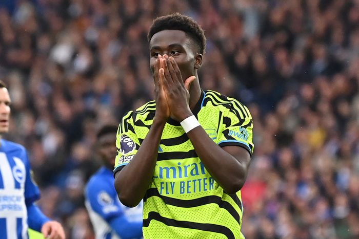 Saka reagerer etter sin store sjanse. Foto: AFP