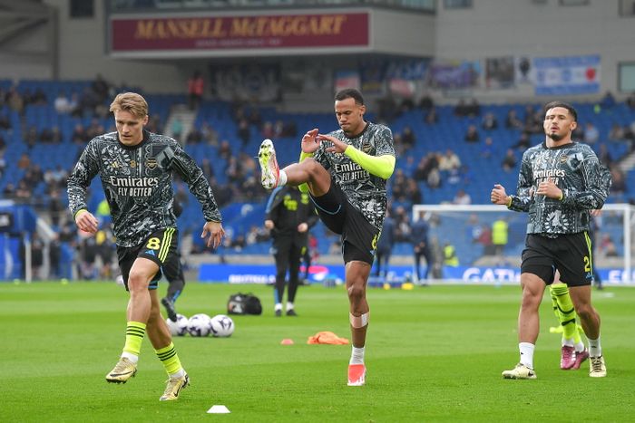 Nære for Gabriel! Ødegaard stopper først opp, så svinger han inn et frispark. Brightons målvakt kommer ut og er satt ut av spill. Stopperen nikker like utenfor stolpen.