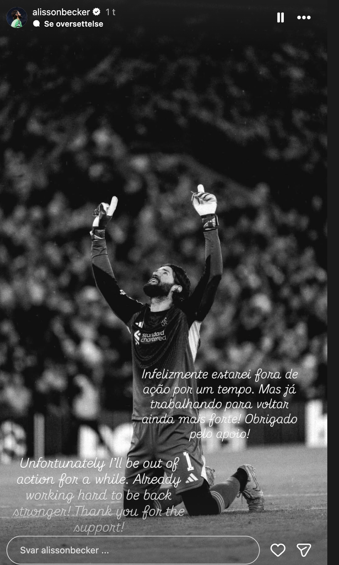 Stjernekeeper Alisson Becker skriver på Instagram at han er "ute av spill en stund". Den brasilianske landslagsmålvakten spilte ikke bortekampen mot Galatasaray i Champions League, men har vært tilbake i de to neste, inkludert 4-0 hjemme over det tyrkiske storlaget.