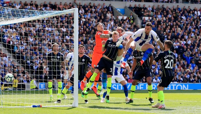 BRIGHTON TAR LEDELSEN! MURRAY STANGER INN CORNEREN! Murray lurer seg inn på første stolpe, knuser Zinchenko og Ederson i duellen. (Foto: Gareth Fuller/Pa Photos)