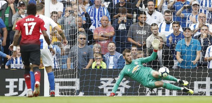 Straffe til Brighton & Hove Albion! Kjemperom for Brighton etter at Fred mister ballen på midtbanen. Gross får ballen mellom Bailly og Lindelöf, og Bailly klarer ikke gjøre det godt igjen når han meier ned Brighton-spilleren.