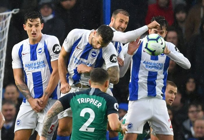 Straffe til Tottenham Hotspur! Trippiers forsøk som ble stoppet i muren, ble stoppet av en arm. Det blåses straffe for hands. Murray er synderen. Foto: REUTERS
