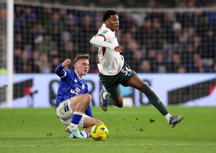 Cardiff kommer til en halvsjanse. Ashford bruker litt for lang tid, og Santos får inn en takling. Hjemmelaget vil ha straffe, men dommer Harrington er uenig.