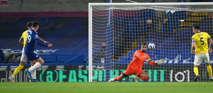 Fryktelig forsvarsspill av Brighton. Først er det Webster med et grusom tklareringsforsøk, og deretter rører White det til i eget felt. Havertz kommer til skudd fra 12 meter - Sanchez redder!