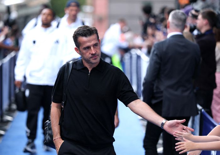 FULHAM-MANAGER Marco Silva på vei inn på Stamford Bridge. Det er klart for London-derby. Foto: REUTERS