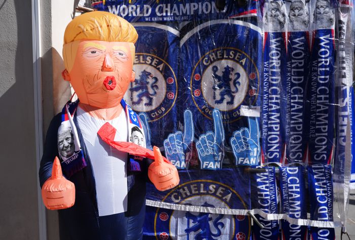 CHELSEAS MANN? Donald Trump utenfor Stamford Bridge. Trump delte ut pokalen til Cole Palmer etter at de vant VM for klubblag i sommer. Trump sa han var en stor Palmer-fan. Så spørs det om det er noen i London som vil gå rundt med Chelsea-skjerf med ansiktet til Trump. Det er iallfall til salgs. Foto Pa photos.