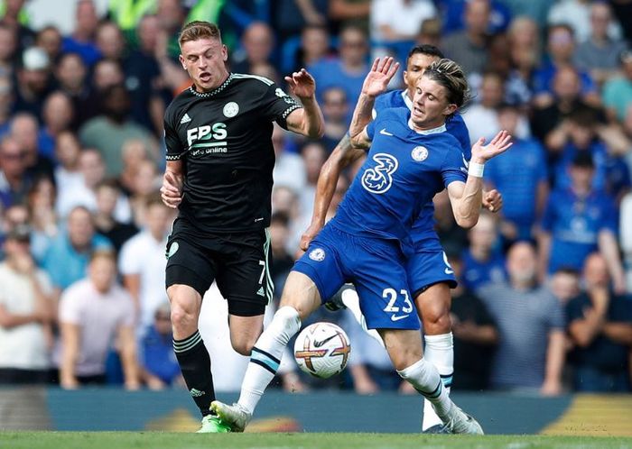 Loftus-Cheek går over ende i duell med Tielemans. Tielemans mister balansen og feller Chelsea-spilleren.