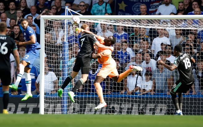 Leicester får frispark fra 20 meters hold. Cucurella avklarer med en heading.