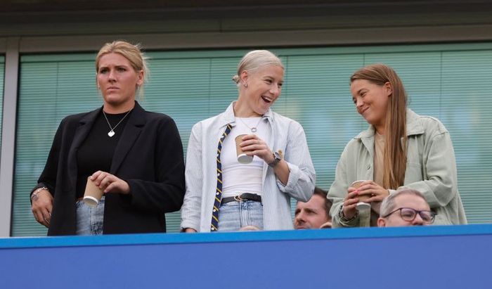 Det er noen ferske europa-mestere på tribunen i ettermiddag. Chelsea-spillerne Millie Bright, Bethany England og Fran Kirby bruker ettermiddagen på Stamford Bridge. Foto: Reuters