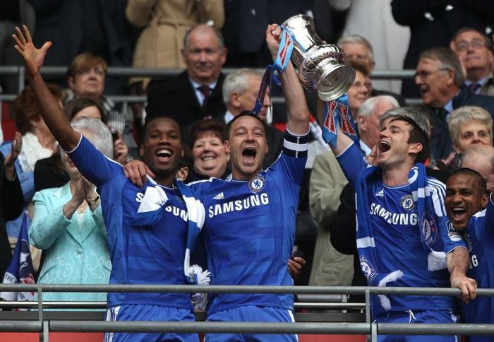 Liverpool er i sin første FA-cupfinale siden 2012. Didier Drogba ble matchvinner for Chelsea i 2-1-seieren den dagen, 5. mai 2012. Her løfter han troféet sammen med John Terry og Frank Lampard. Foto: PA Photos