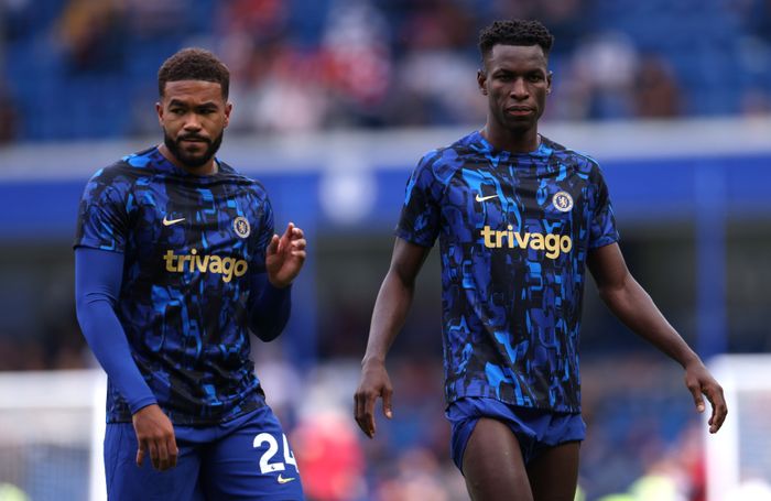 Chelseas nye kaptein Reece James (t.v.) og nysignering Nicolas Jackson i oppvarming.