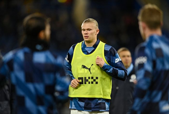 Han er norsk. Han er toppscorer. Han spiller i kveld. Her er Haaland ute på gresset noen minutter før kampen starter i kveld. Foto: Reuters.
