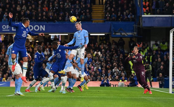 Så kommer Chelsea seg ned til linjen, får lagt inn. Nære. Beholder ballen, men så overtar City og da løper Haaland fremover.