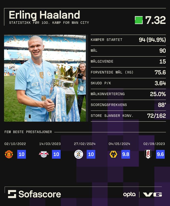 Erling Braut Haaland spiller altså sin 100. kamp for Manchester City. Her er status etter 99 kamper:
