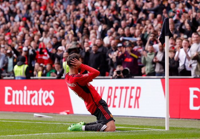 United går for en innøvd variant og spiller til Garnacho ute på sekstenmeteren. Avslutningen er ufarlig.