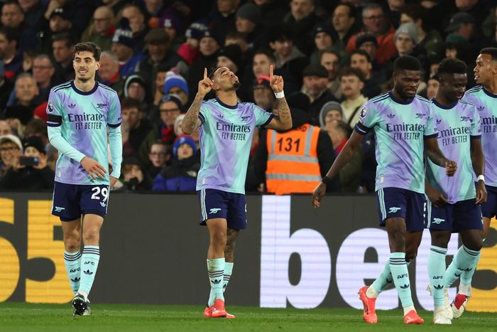 Saka får ballen på høyresiden og slår inn (et meget godt innlegg), ballen går forbi flere Arsenal-spillere og enda flere Palace-spillere, men bakerst står Gabriel Jesus og skyter ballen sikkert i mål. Dean Hernderson kaster seg, men når ikke ballen.