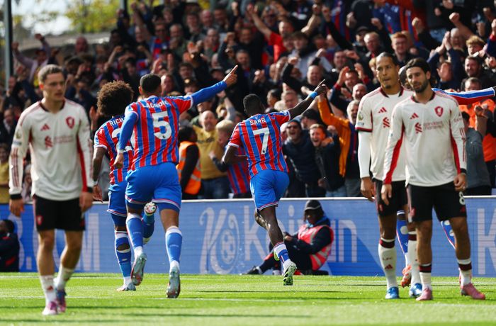 Så scorer Palace på corneren! Gravenberch er uheldig i duellen med Guehi og header rett i beina til Sarr, som enkelt kan sette ballen i mål fra én meter. Se scoringen her: https://tv.vg.no/video/342874/ismaila-sarr-sender-crystal-palace-i-ledelsen-hjemme-mot-liverpool
