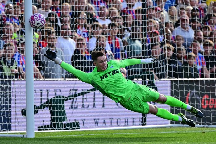 Gakpo slår hardt inn, rett i hendene til Henderson.