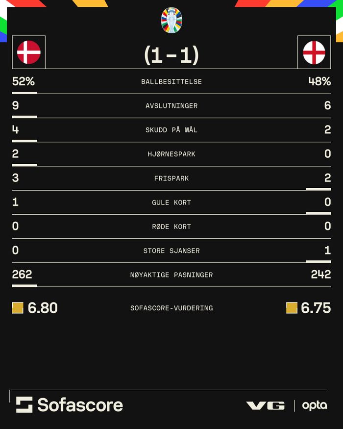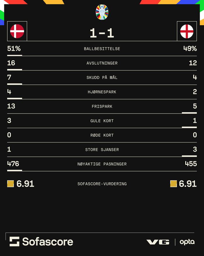 Der er det slutt! 1-1 og det er kanskje et greit resultat. Danskene imponerte etter at England tok en tidlig ledelse ved Kane. Nå er denne gruppen virkelig åpen igjen!
