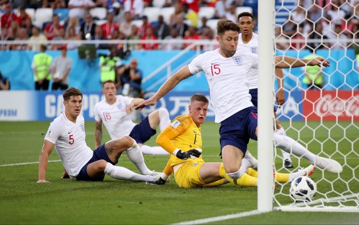 Merkelig situasjon! Belgia legger inn fra høyrekanten og i feltet header Fellaini ballen ned til Batshuayi. Pickford kaster seg over ballen, men glipper den bakover mot eget mål. England slipper med skrekken i det Cahil banker ballen bort fra streken. Foto: Reuters