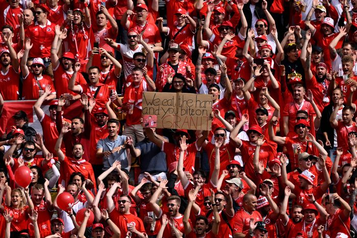 God stemning på tribunen blant de sveitsiske supporterne. Foto: AFP