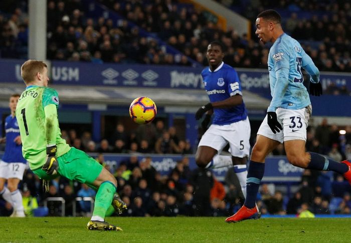 De Bruyne spiller frem Jesus, og han kommer alene med Pickford. Keeperen blokkerer delvis første avslutning og innbytteren får hodet på returen - ballen spretter inn i målet.