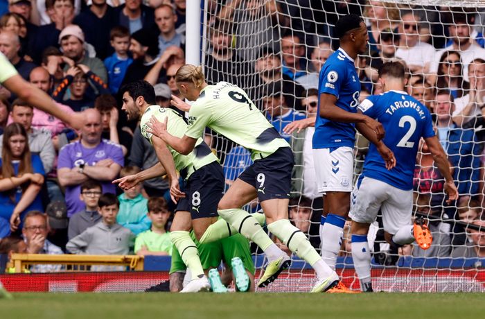Og så sitter også scoringen for Haaland! Det er Gundogan som plukker opp en løs ball og slår inn ballen fra siden. I boksen står Haaland helt umarkert og stanger ballen på mål. Pickford er på ballen, men klarer ikke å hindre scoring.