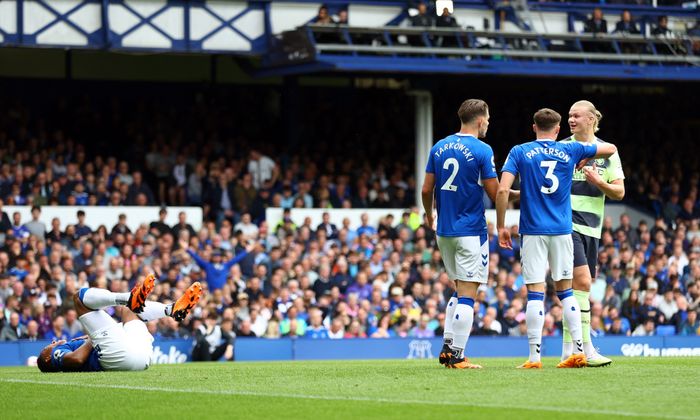 Interessant situasjon der Haaland er involvert! City kontrer lynhurtig, der Mahrez slår inn mot Haaland i boksen. Tarkowski får forlenget ballen unna. Haaland løper etter ballen, stopper opp og blir løpt ned av Pickford. Haaland oppsøker imidlertid den kontakten veldig, for min del er det en obstruksjon av Haaland, ikke en forseelse av Pickford. Spilles vinkes uansett videre.