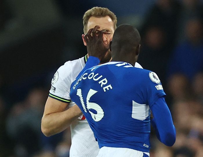 Tarkowski feller Kane, som får frispark på hjemmelagets halvdel.
