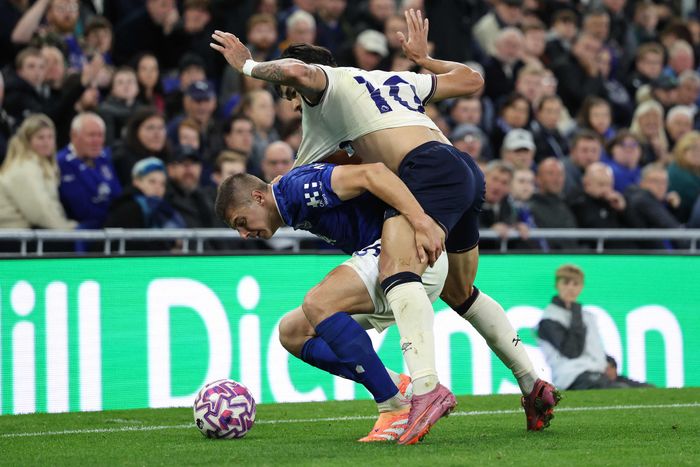 Walker-Peters blir for ivrig i det han prøver å ta ballen fra Grealish, som skjermer den uten å bli særlig stresset. Frispark til Everton.