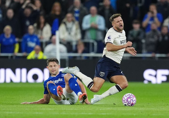 Summerville spilles i bakrom, noe Tarkowski har lest for lenge siden. Slår ballen rett i West Ham-vingen og vinner innkastet, Everton-kapteinen.