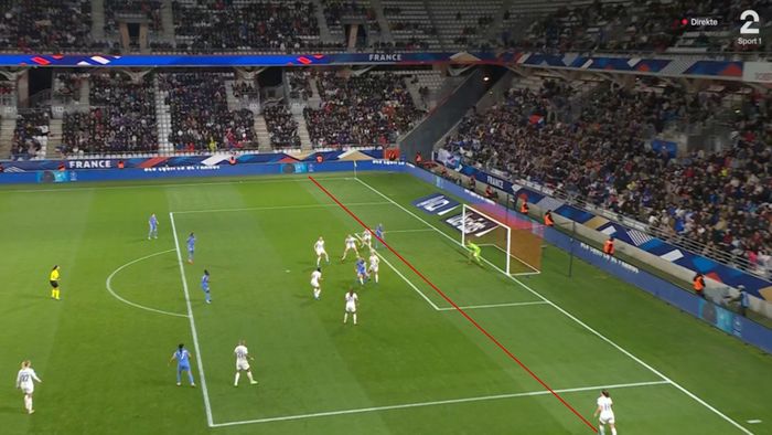 Så går ballen i tverrliggeren på et innlegg fra Le Sommer. Nå reddes Norge av metallet!