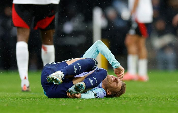 Ødegaard rister på ankelen sin. Ser ut som han sliter. Skjærer grimase. Litt uklart om det kom etter en duell. Men han fortsetter å spille.