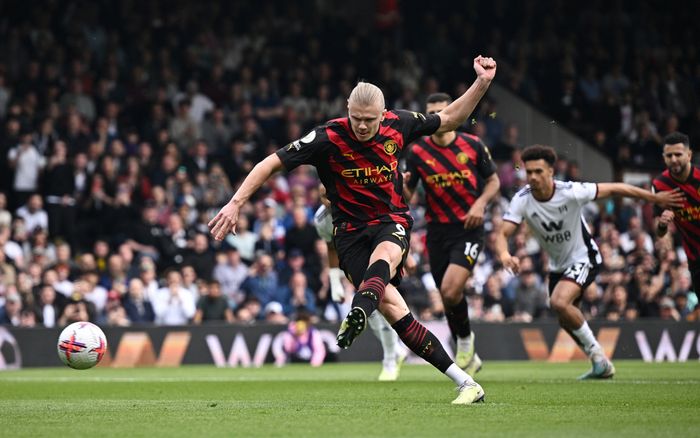 Han er iskald! Bernd Leno går riktig vei, men Haalands straffe er helt nede i hjørnet! Dermed har han tangert rekorden for flest mål i Premier League på én sesong: 34 mål!