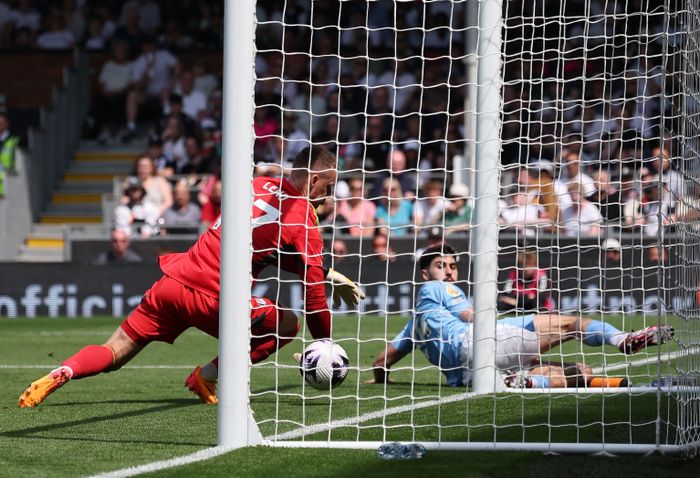 Haaland med sin første sjanse! De Bruyne med et nydelig innlegg til Silva over Fulham-forsvaret. Silva styrer den ned til Haaland, som alene fra seks-syv meter dunker ballen langt over mål på spretten.