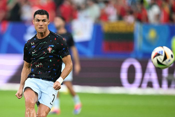 Innbitt Ronaldo under oppvarming i Gelsenkirchen. Foto: EPA