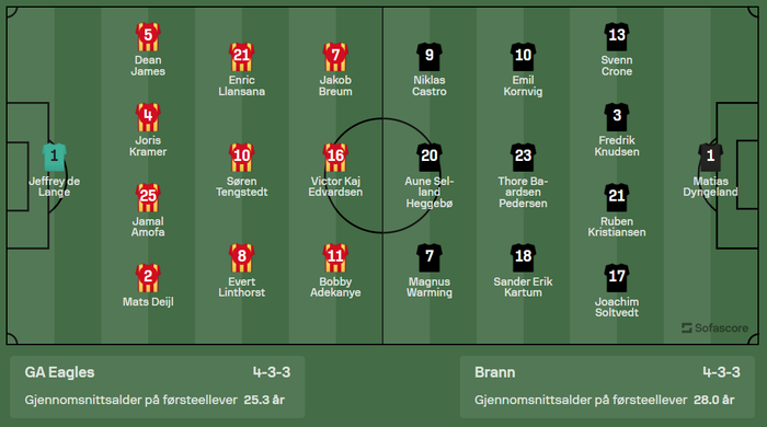 Lagoppstilling Go Ahead Eagles (4-3-3): De Lange - Deijl, Amofa, Kramer, James - Linthorst, Tengstedt, Lllansana - Abekanye, Edvardsen, Breum.