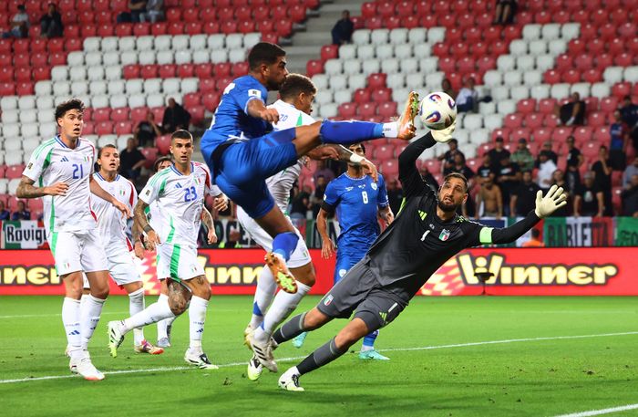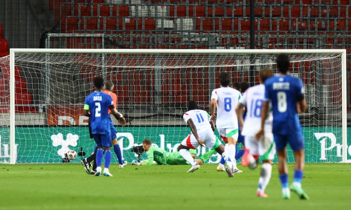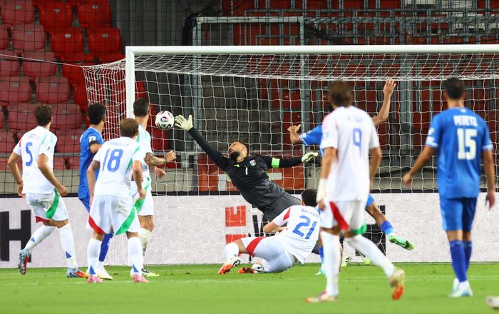 FOR EN SJANSE! Israel prøver å spille i bakrom. Donnarumma skal ut å hente ballen, men gir retur. Gloukh avslutter forbi sisteskansen, men en italiensk forsvarer redder foran det åpne målet.