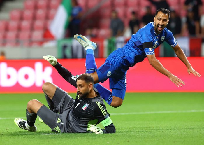 Israel scorer - tror de! Donnarumma bokser ballen i eget mål, men dommer Vincic blåser frispark for målvakten etter duellen med Lemkin.